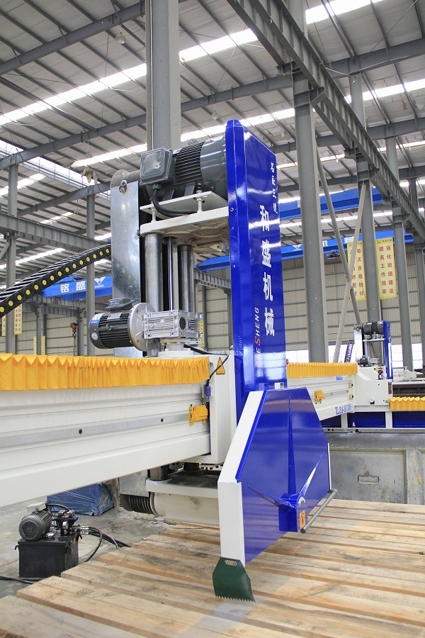 該機采用大跨度橋式結構,機身采用四導柱(直徑100mm)液壓升降,配有液壓推動旋轉工作臺,大梁移動實現橫向分片。具有加工長度大,切割深度大,旋轉靈活,定位準確,剛度大,工作平穩等特點。主機采用進口變頻器可實現切割速度的無級調速。適合大批量加工路沿石及高價值的墓碑石。