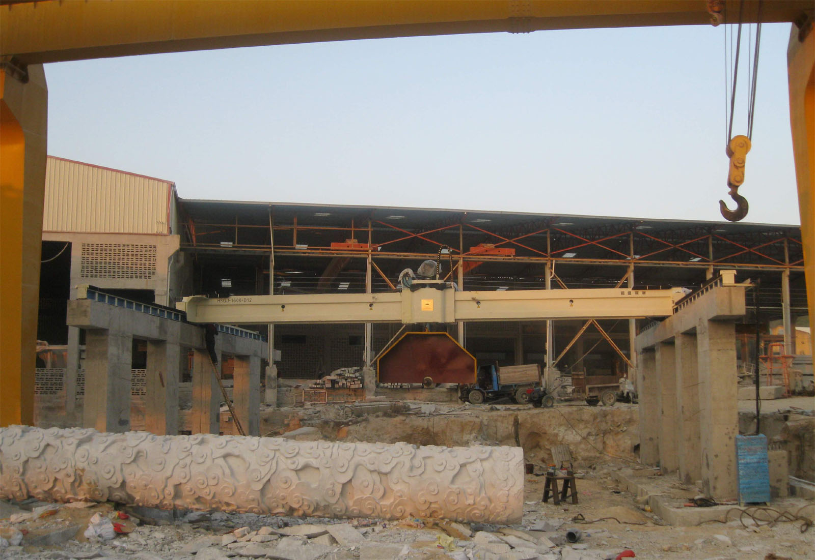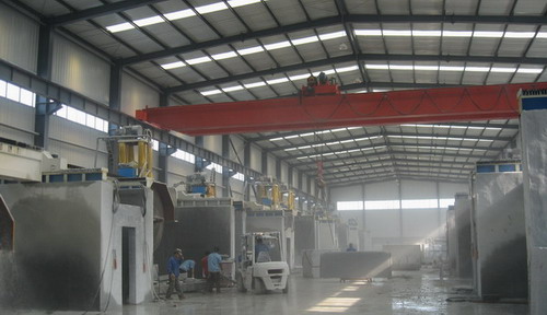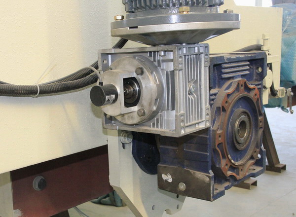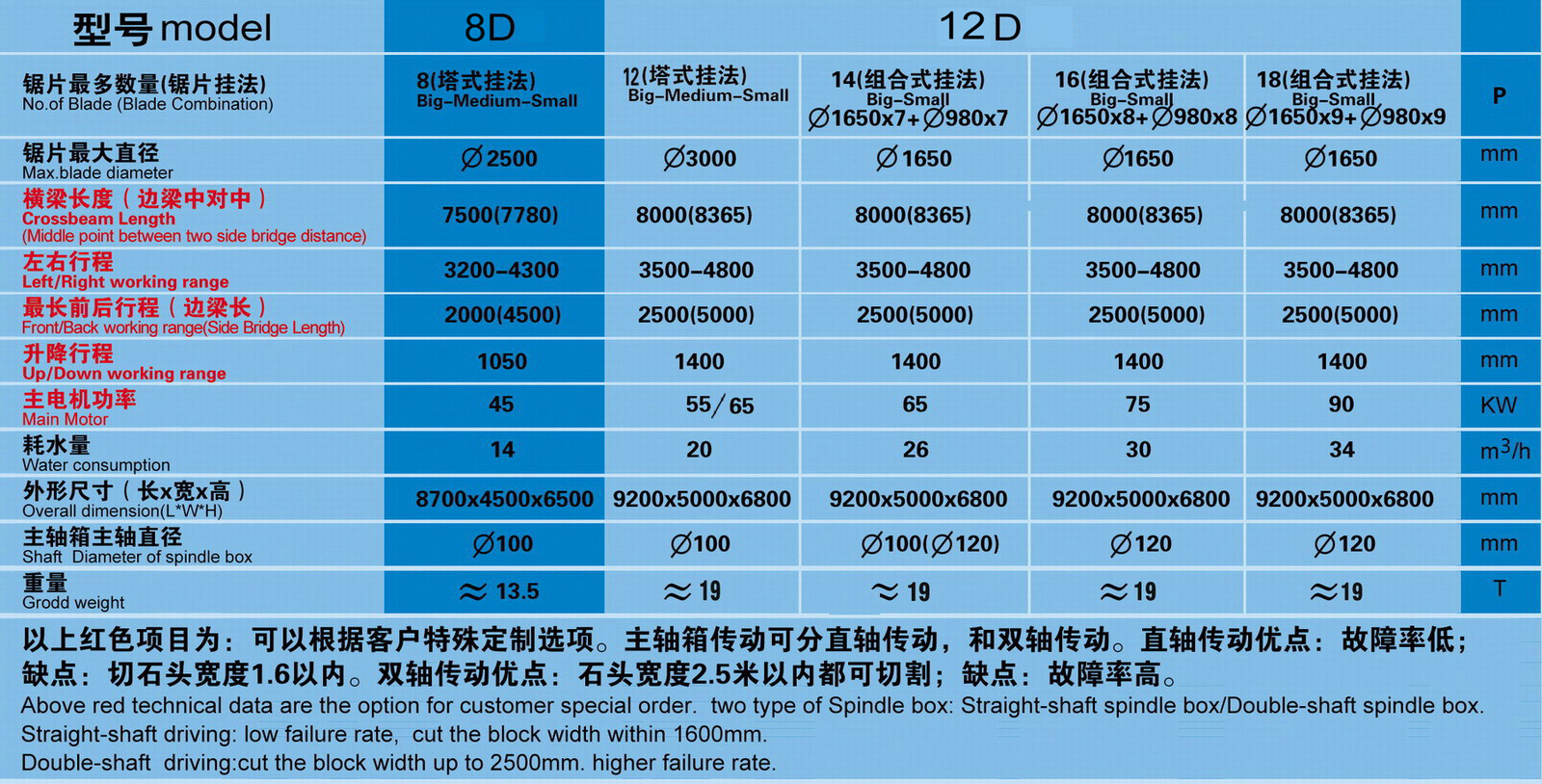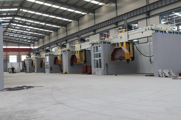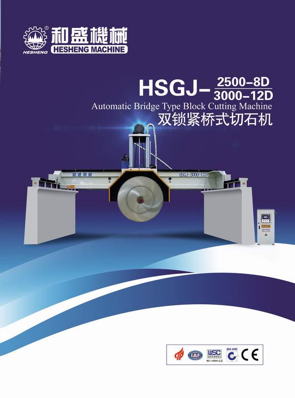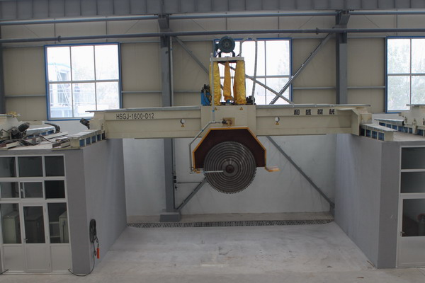 本機采用大跨度橫梁結構, 整體機身重; 橫梁導軌采用進口線性軌道; 機身升降結構采用四立柱式液壓升降, 同時采用專有技術: 立柱及邊梁,在切割時有液壓鎖緊裝置,確保切割時整體機身不晃動, 切割效率好, 板材平整度高, 是切割大規格高價值進口大荒料的理想設備. 1: 機身采用專有技術"液壓鎖緊裝置",在機械有磨損或切割過程中可減小機身間隙,有利于提高板材的平整度和延長刀頭使用壽命 (*選配 Alternative)。