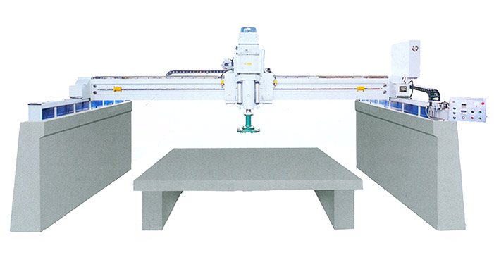 | 該機采用橋式整體結構,工作時磨頭安裝在在中間滑體一側,采用氣壓升降,中間滑體在主梁作左右運動,主梁在導軌梁上做前后運動,工作臺板不做任何運動,使機械在工作時更加平靜,采用氣動加壓,減少了工人的勞動強度。是拋磨、大板、墓碑等大規格石材的理想設備。